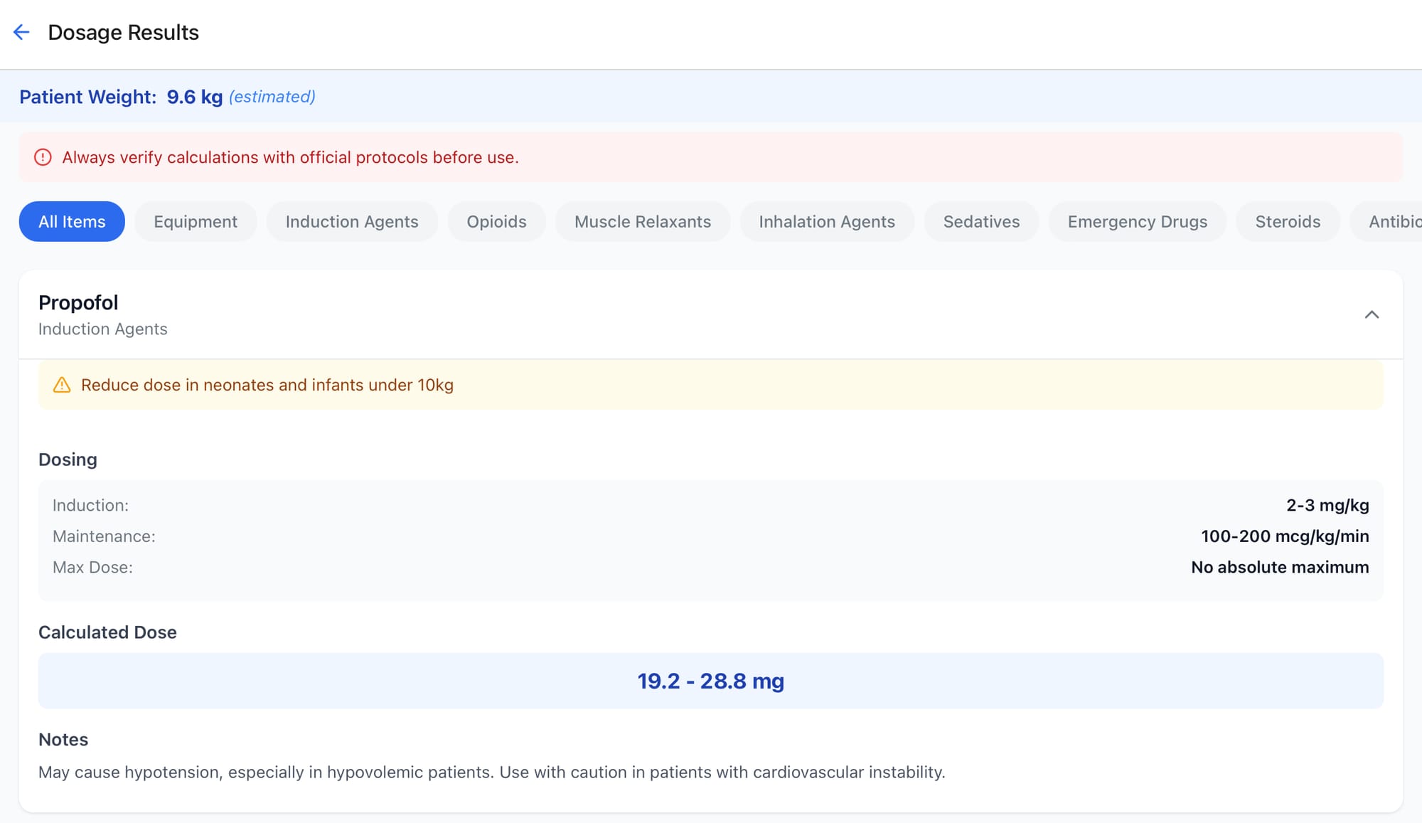 Once you have a calculated weight, it generates weight-based drug and equipment prescriptions: